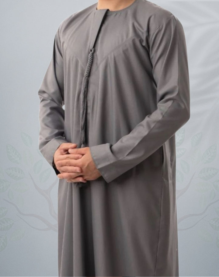 Crafted with precision in the UAE, our Sultan Grey Thobe redefines sophistication through its perfect balance of understated luxury and contemporary style. The exquisite khaloud grey hue embodies, a versatile shade that transitions effortlessly from daytime business meetings to evening gatherings